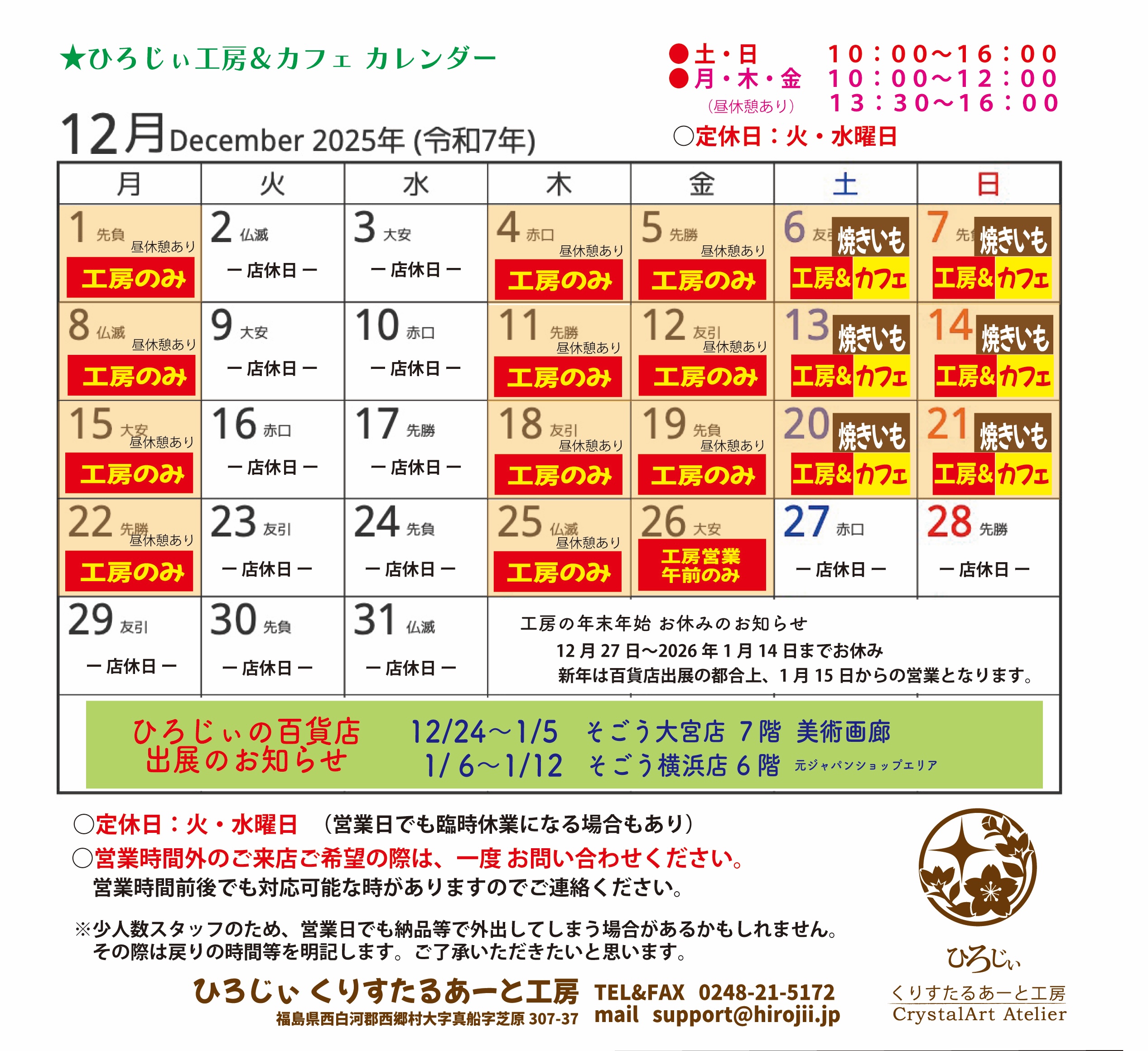 2025年 12月 工房&カフェ 営業日 クリックで拡大