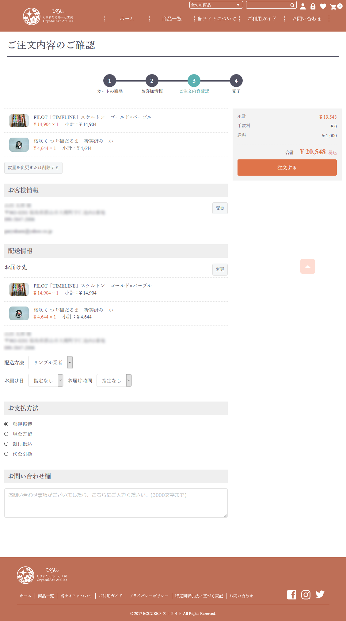 次の画面で、お支払方法・お届け時間の指定及びお問い合わせ事項の入力を行い、内容確認へ進みます。
