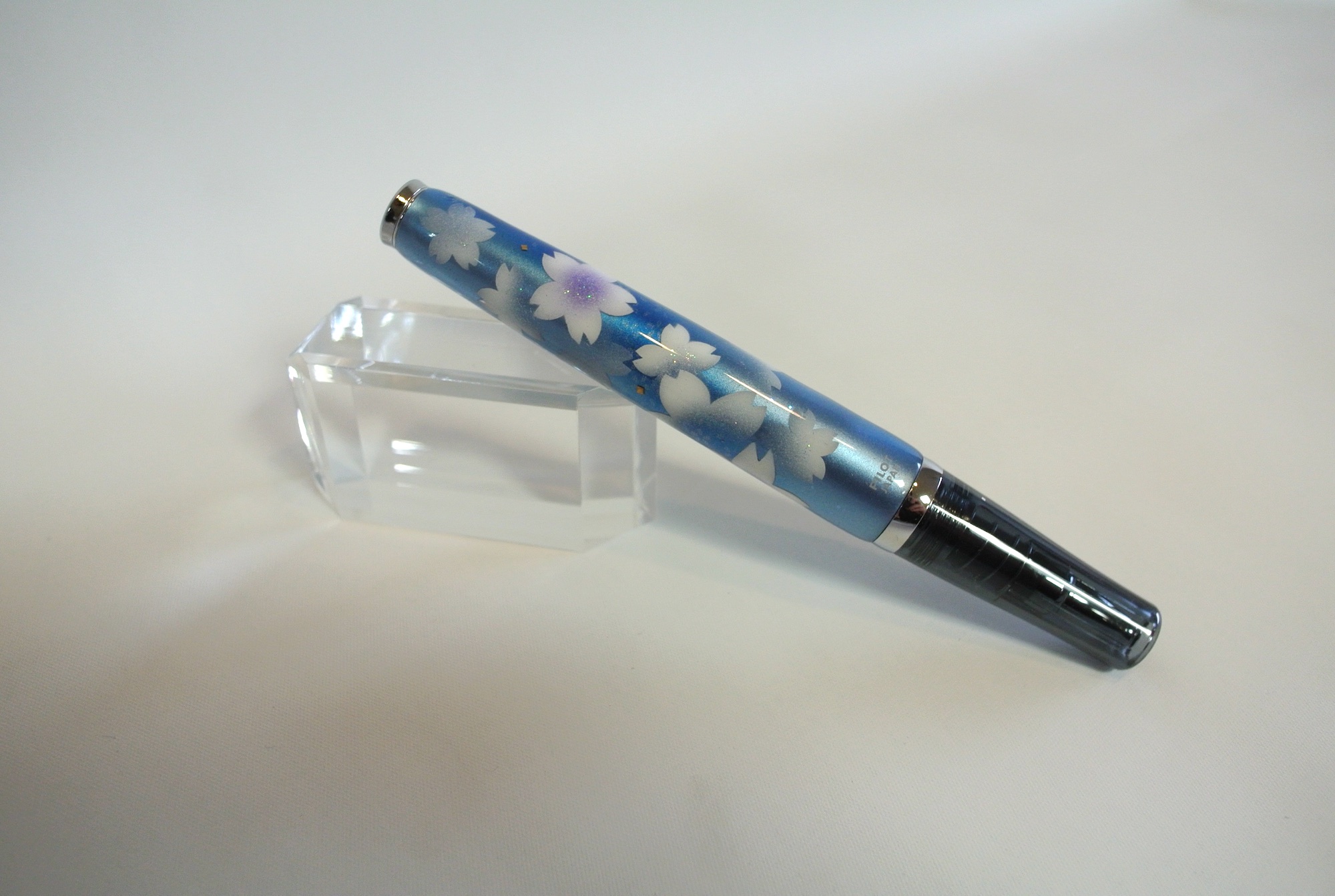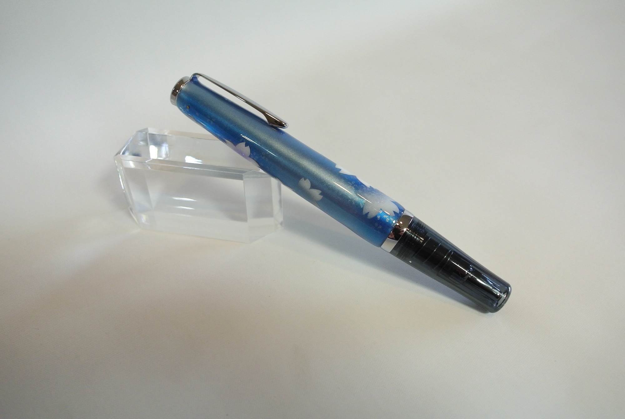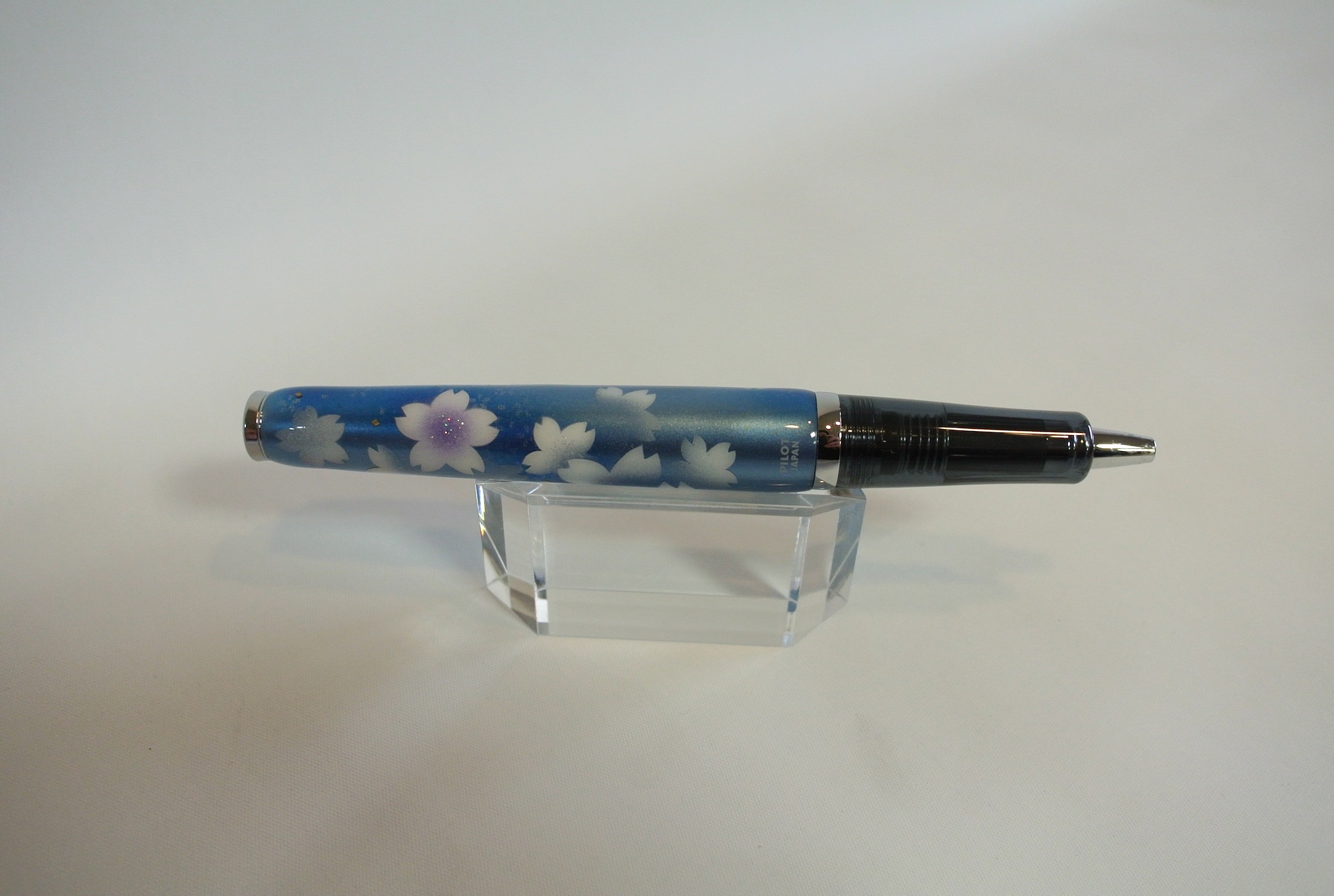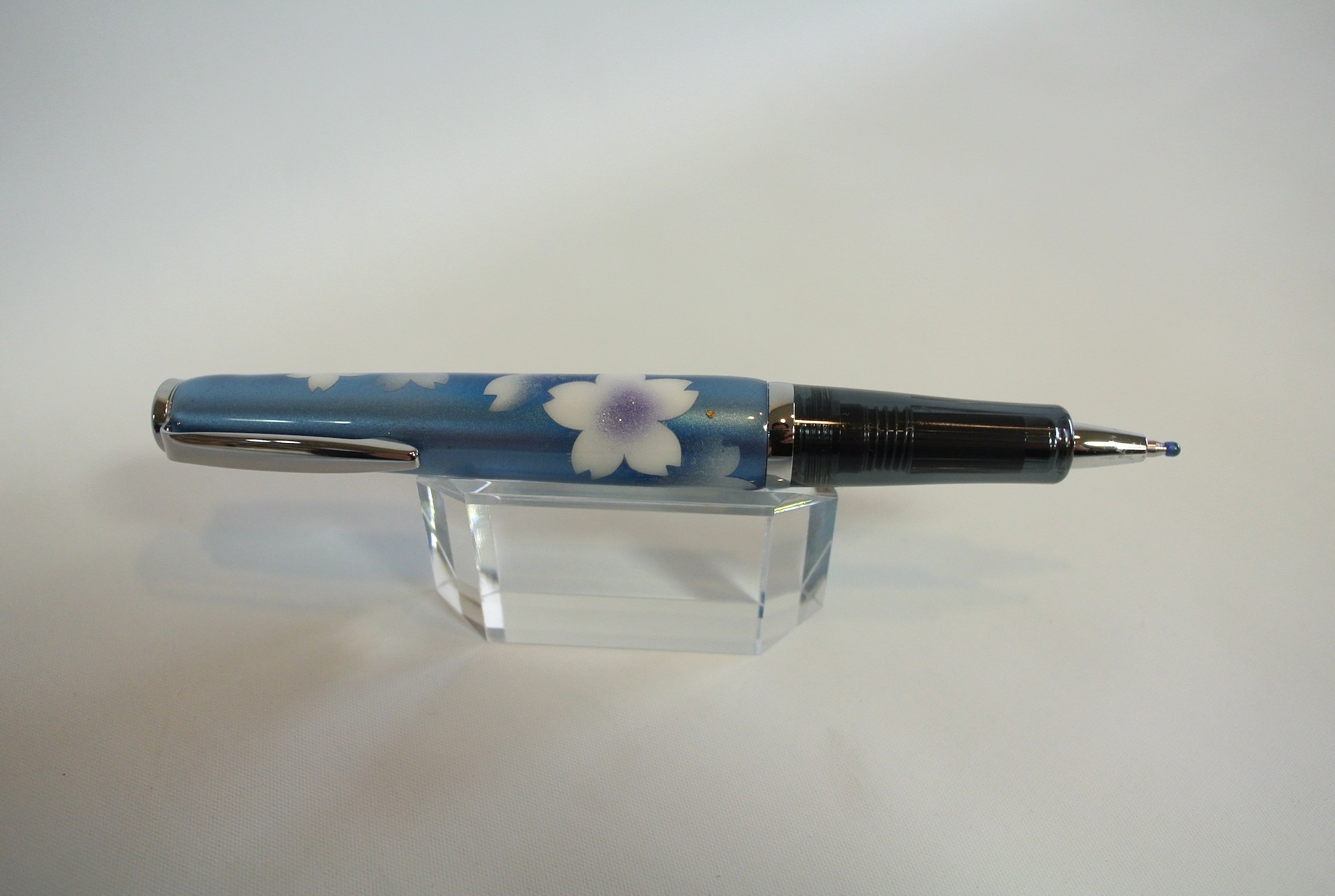 アクアブルーのベースに大きな桜を重ねて描いています。 クールかつ大胆、人目を惹くデザインです。 ひろじぃボールペンは、パイロット製タイムラインをベースにアート・コーティングしています。 もちやすく書き味も良いので手放せません。 他の誰も持っていないボールペン! 一つ一つ心を込めてアートしています。