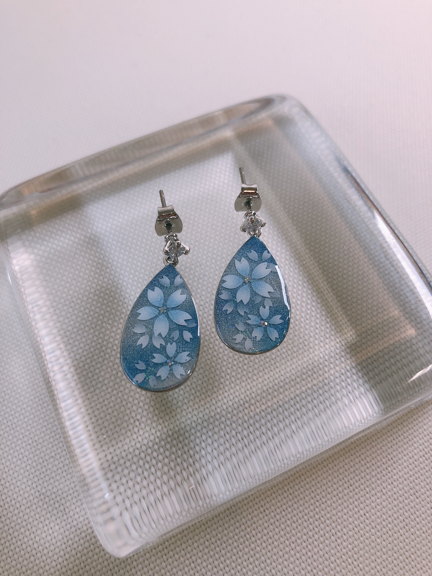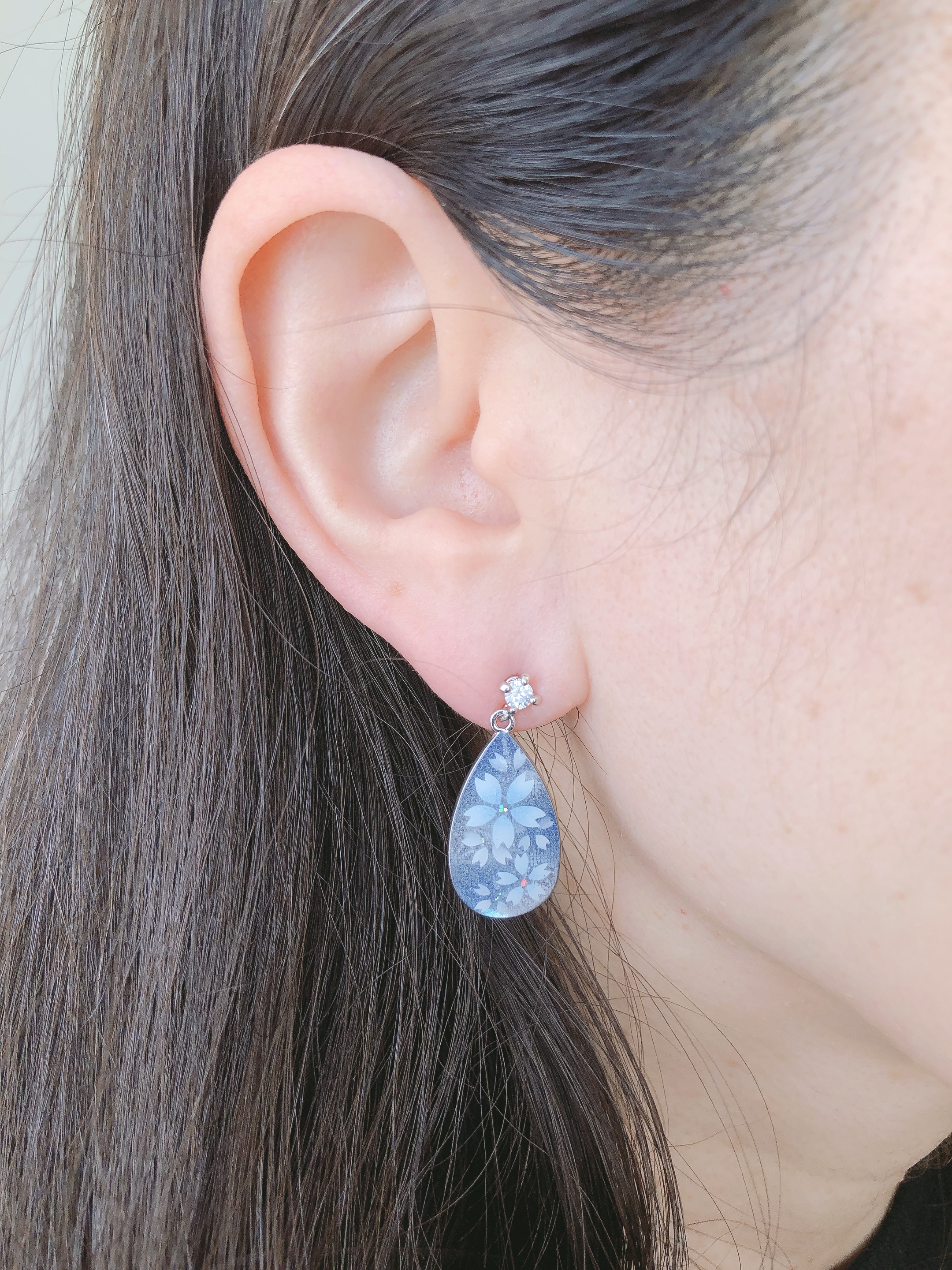 滴型のシルバーのピアスにくりすたるアートを施しました。麻の葉を背景に優しい水色をアクセントにした桜をアートしました。