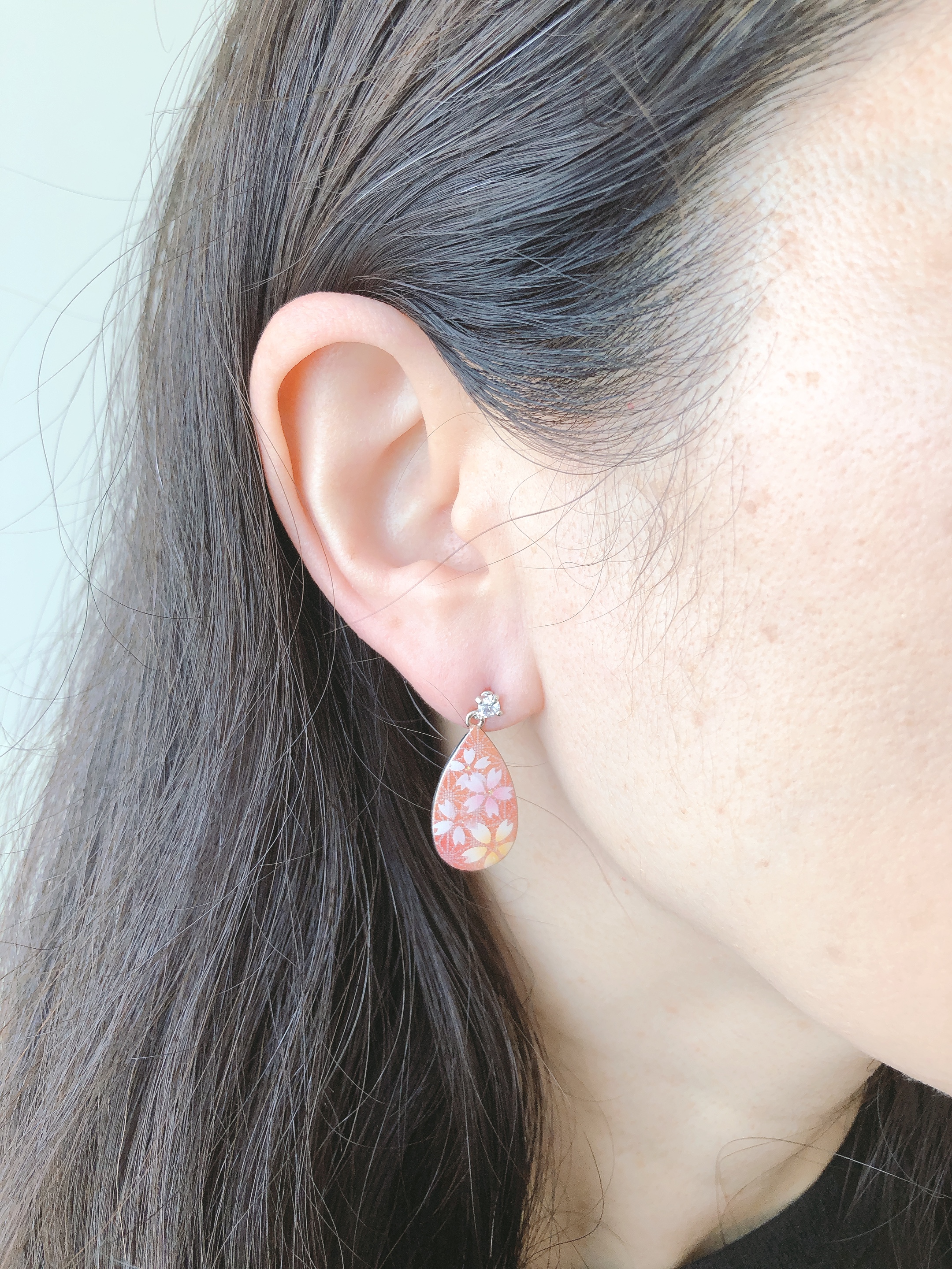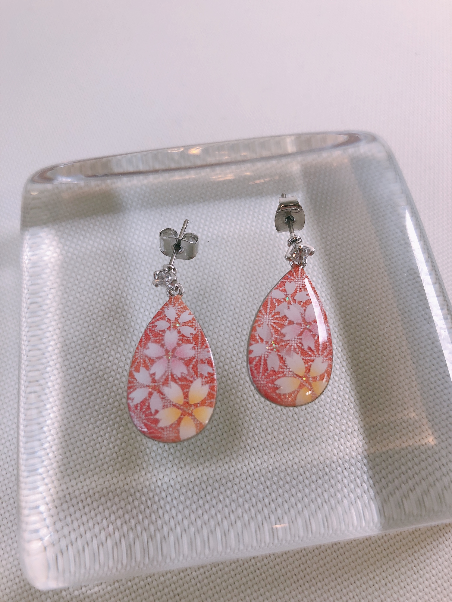 滴型のシルバーのピアスにくりすたるアートを施しました。麻の葉を背景にピンクと黄色をアクセントにした桜をアートしました。