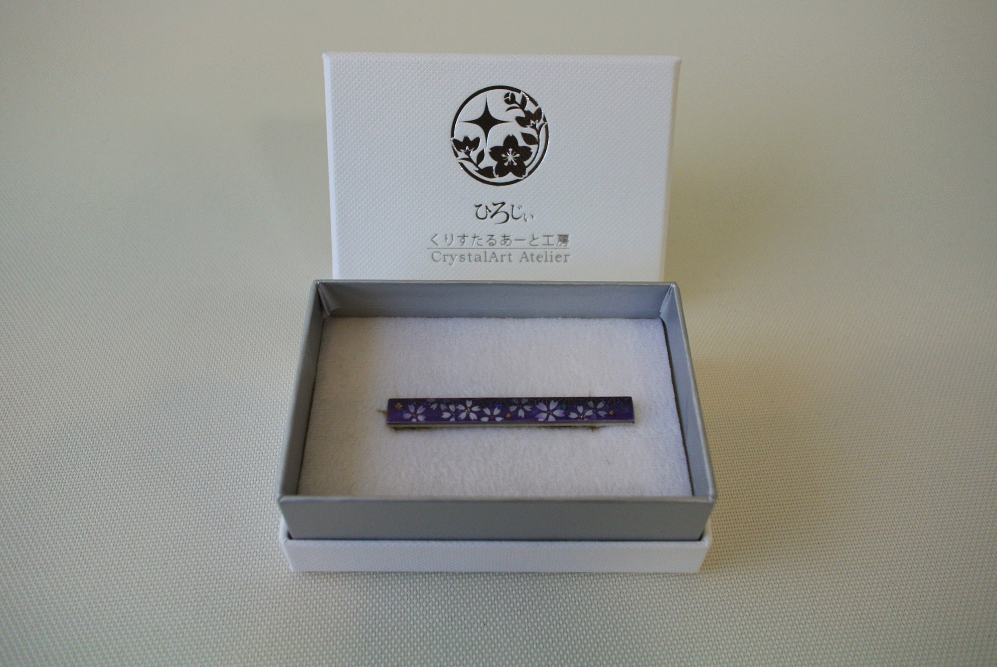 桜花を舞わせ、見る角度により虹色に光る螺鈿(ラデン)の花びらを一枚をのせ、引き締めました。